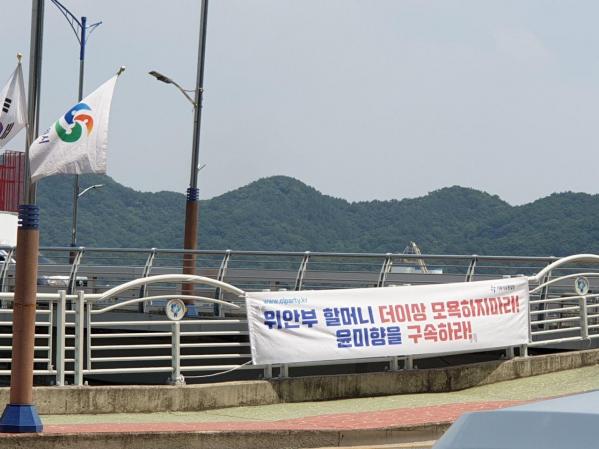 [times창원] 위안부 할머니 더 이상 모욕하지마라! 윤미향을 구속하라!는 문구가 인쇄된 현수막이 마산합포구 해안로 인근에 부착됐다. 과연 이 나라가 정상적인 나라인지 의심스럽다. 한 번도 경험하지 못하는 나라를 경험 시켜주는 대단한 촛불 정부답다.
