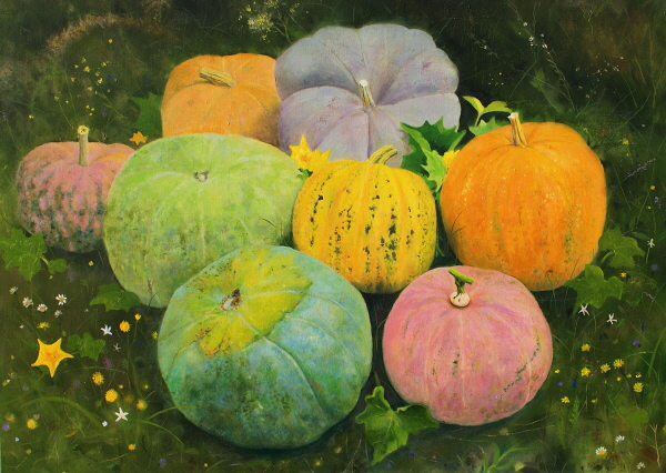 화폭에는 길쭉한 호박, 작달막한 호박, 붉거나 푸른 호박들이 저마다 다른 색채와 모양으로 담겨 있다. 서로 다르지만 투실투실 모나지 않은 모습으로 둥글게 공존하는 호박의 모습은 점점 각박하고 뾰족해져 가는 현대인의 삶에 위로를 전하는 듯하다.