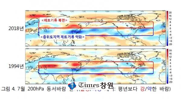 이로 인해, 두 해 모두 중위도 지역에서의 제트기류가 평년보다 북쪽에 위치하여 중위도 대기상층의 동서흐름이 정체되면서 폭염이 지속된 것으로 분석된다.