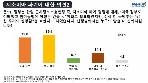 “정부는 한일 군사정보보호협정 즉, 지소미아 파기 결정에 대해, ‘미국 정부도 이해했고 한미동맹에 영향은 없을 것“이라고 발표하였지만, 정작 미 국방부는 "강한 우려와 실망감"을 표한다고 하였습니다. 선생님께서는 누구의 말을 더 신뢰하십니까?”라는 미국정부를 신뢰한다는 응답은 35.8%, 한국정부의 말을 신뢰한다는 응답은 39.1%, 양쪽다 신뢰하지 않는다는 응답은 14.1%, 양쪽다 신뢰한다는 응답은 6.7%로 나타났다.'잘 모르겠다'고 응답자는 4.3%로 나타났다.