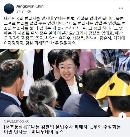 [times창원]진중권 전 동양대 교수가 31일 자신의 페이스북을 통해 [서초동살롱]"나는 검찰의 불법수사 피해자"…무죄 주장하는 여권 인사들 이라는 기가제목을 링크한 후"대한민국의 범죄자를 일거에 없애는 방법. 검찰을 없애면 됩니다"라고 제안했다.