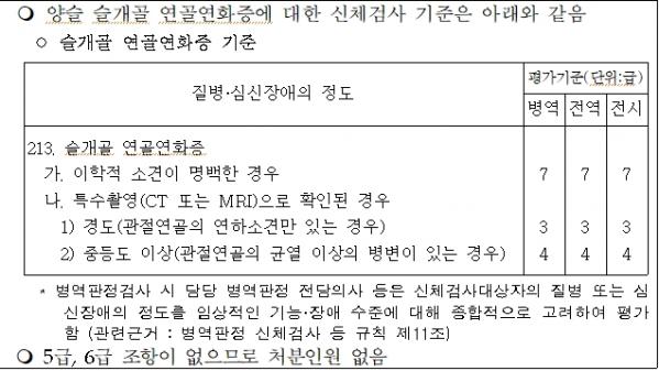 그러나 병무청의 입장은 정반대였다. 병무청은 추 장관 아들의 병명인 ‘양슬 슬개골 연골연화증’과 ‘양슬 슬개대퇴관절 추별증후군’은 ‘병역판정 신체검사 등 규칙’ 상 병역면제 규정이 없으며, 따라서 지금까지 병역면제처분(5급, 6급) 처분을 받은 인원도 없다고 밝혔다. 규정에 따르면, 재검후 중증판정을 받아도 보충역(4급)으로 복무해야 하도록 되어있다.