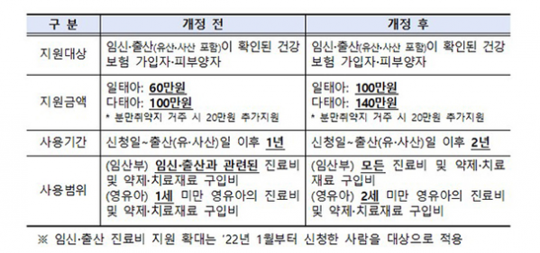 또한 사용기간이 출산(유산·사산)일 이후 1년에서 2년으로 연장되며, 지원항목은 임신·출산과 관련된 진료비 및 약제·치료재료 구입비에서 모든 진료비 및 약제·치료재료 구입비로 확대한다.