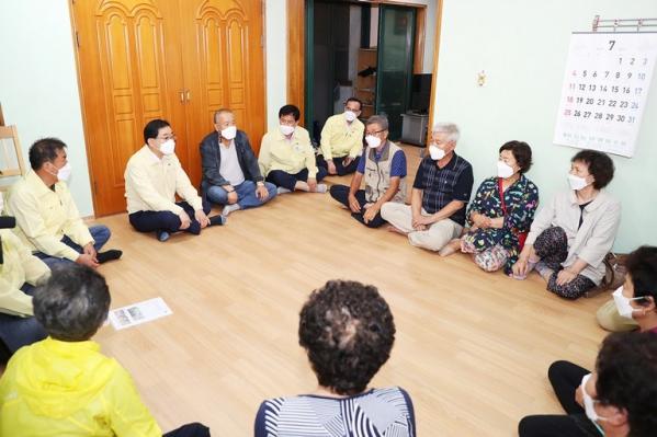 [times창원]허성무 창원시장은 7일 저녁 집중호우로 산사태를 우려해 동읍 봉산마을회관으로 대피한 주민들을 찾았다.