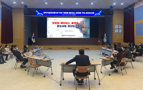 [times창원]창원특례시는 21일 시청 시민홀에서 안경원 제1부시장 주재로 미래전략산업국, 경제일자리국, 문화관광체육국 소관 부서장 등 20여 명이 참석한 가운데 ‘창원형 메타버스 플랫폼 구축 공모사업’ 중간보고회를 개최했다.