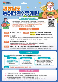 [times창원]경상남도는 농어업의 공익적 기능을 강화하고 농어촌의 지속 가능한 발전을 지원하기 위해 3월 1일부터 31일까지 ‘2026년 농어업인수당’ 신청을 받는다고 밝혔다.   지급 대상은 2025년 1월 1일부터 도내에 주민등록을 두고 농어업경영체 등록을 유지하면서 실제 농어업에 종사하는 경영주이다. 공동경영주는 부부에 한해 인정되며, 수당 신청일까...