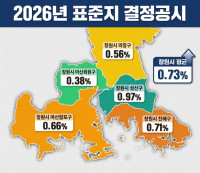 [times창원]창원특례시(시장 권한대행 장금용)는 2026년 표준지 공시지가가 전년 대비 평균 0.73% 상승했다고 밝혔다. 이는 전국 평균 상승률인 3.35%와 경상남도 평균 상승률 1.16%에 비해 낮은 수치로, 창원시의 지가 변동폭이 상대적으로 안정세를 유지하고 있는 것으로 나타났다.   이번 공시지가는 국토교통부의 「2026년 부동산 ...